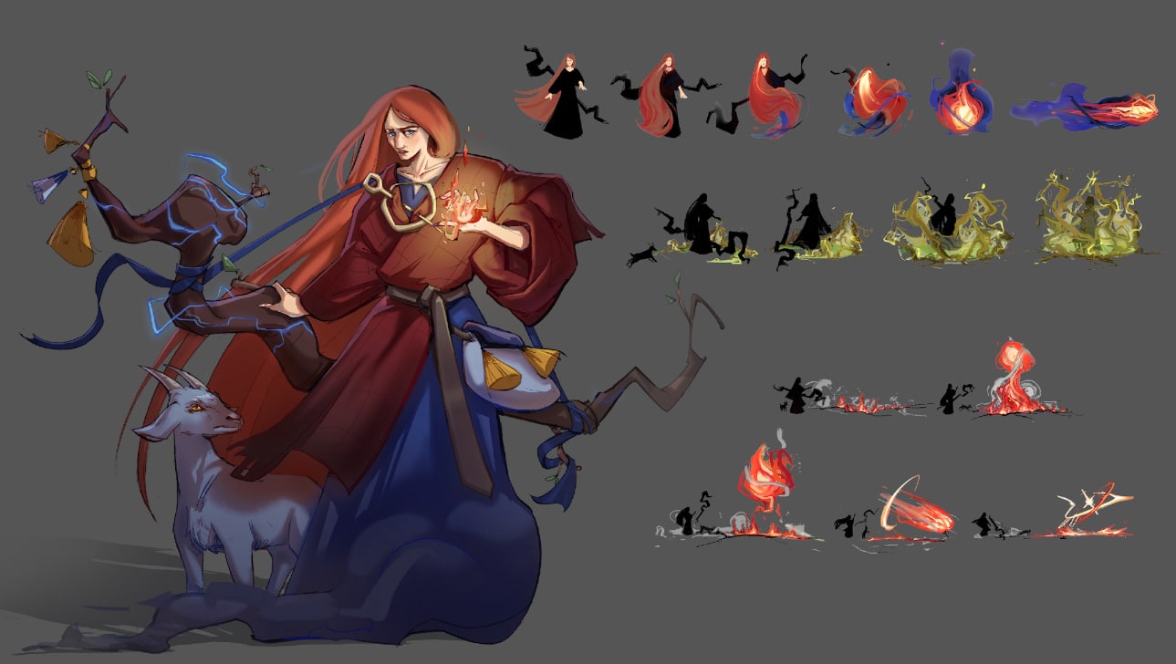 Les personnages sont ceux représentés dans le poème : Tam, un paysan écossais et son cheval Meg, ainsi que Nannie, la sorcière… Leurs vêtements sont des variations sur les habits traditionnels écossais. Ils sont dessinés avec des formes simples qui permettent de les différencier. Nannie a également un aspect incorporel : les sorcières peuvent se transformer en fumée… Pour les couleurs Tam et Meg sont en bleu et Nannie est en rouge. Ils sont associées par leurs couleurs à l’eau et au feu.