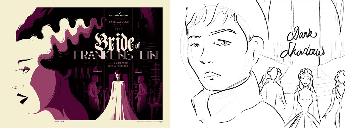« Pour ce projet, je devais réaliser une affiche dans le style de Tom Whalen. J’ai choisi pour cela le film Dark Shadows de Tim Burton. Je devais également sélectionner une affiche de référence parmi les créations de l’artiste, et j’ai opté pour Bride of Frankenstein en raison de sa composition : Plans, contrastes, clair-obscur, monochrome… »