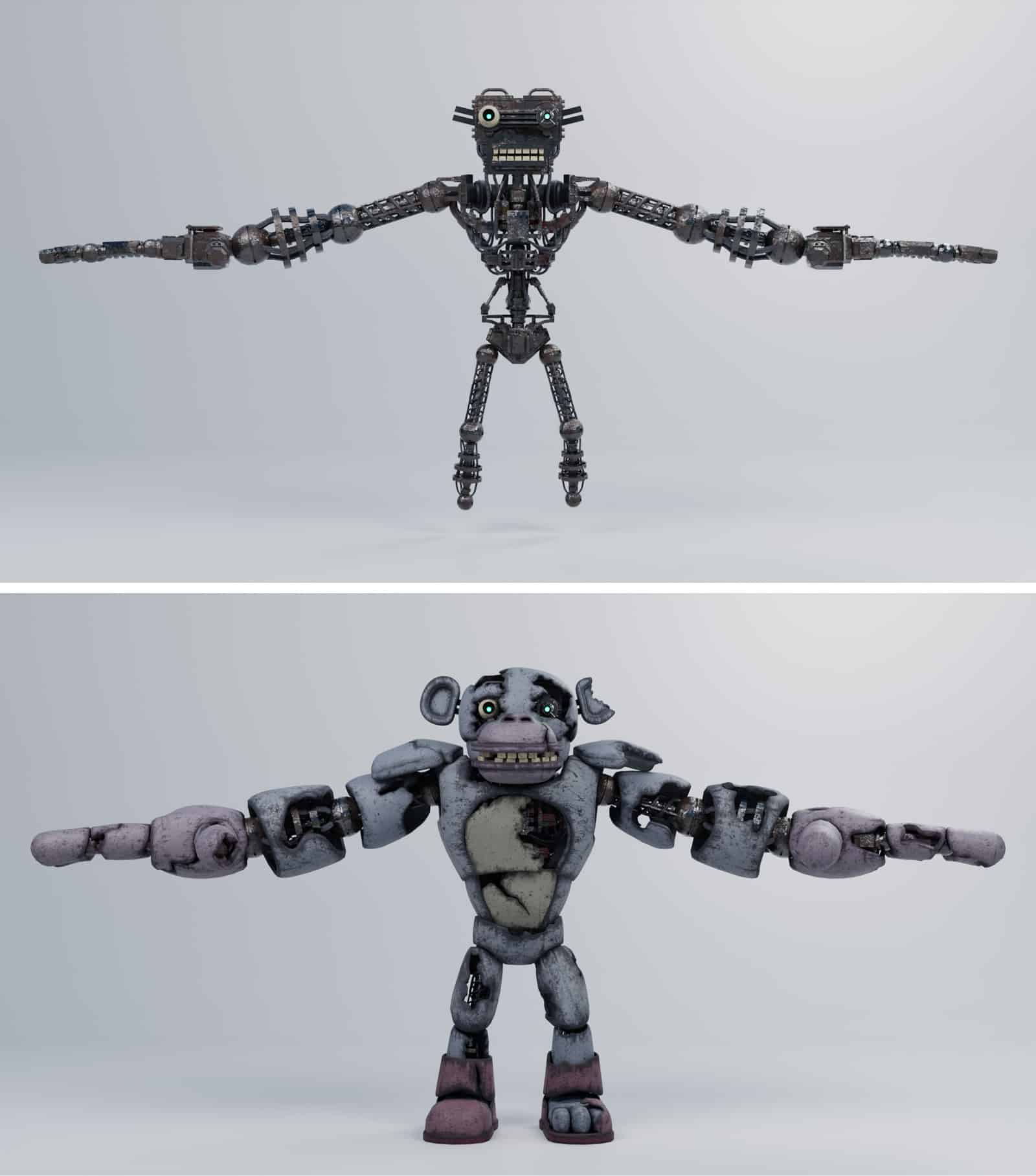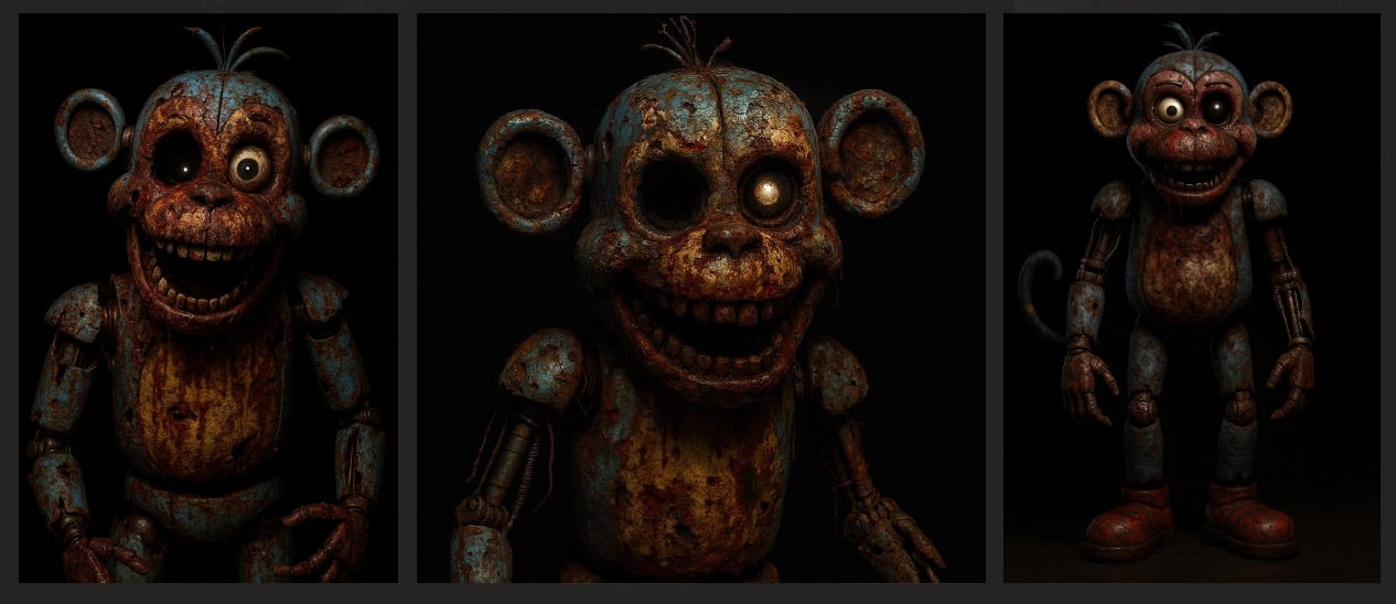 Pour ce personnage, je me suis très clairement inspiré du singe Babouche dans le dessin animé Dora l’Exploratrice (2000), sans pour autant reprendre son nom et son design, et je voulais mélanger cela à l’univers de la franchise du jeu vidéo d’horreur FNAF (Five Nights at Freddy’s)….