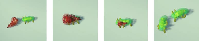 Chaque créature peut se nourrir des cadavres des espèces qu’elle chasse. Une fois assez nourrie, la créature fait naître une autre créature de son espèce.