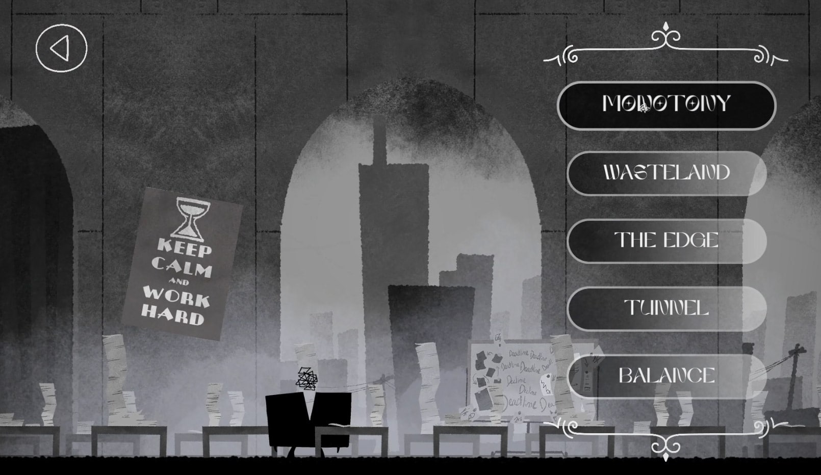 The level design intentions are to arrange the world around five biomes, each presenting a distinct mood and atmosphere. Each biome has its own pacing and specific gameplay situations. These are: Monotony (tutorial) – Wasteland – The edge -Tunnel – Balance (ending). Moreover, each level features a distinct color scheme, visuals, and music to complement its environmental storytelling and narration.